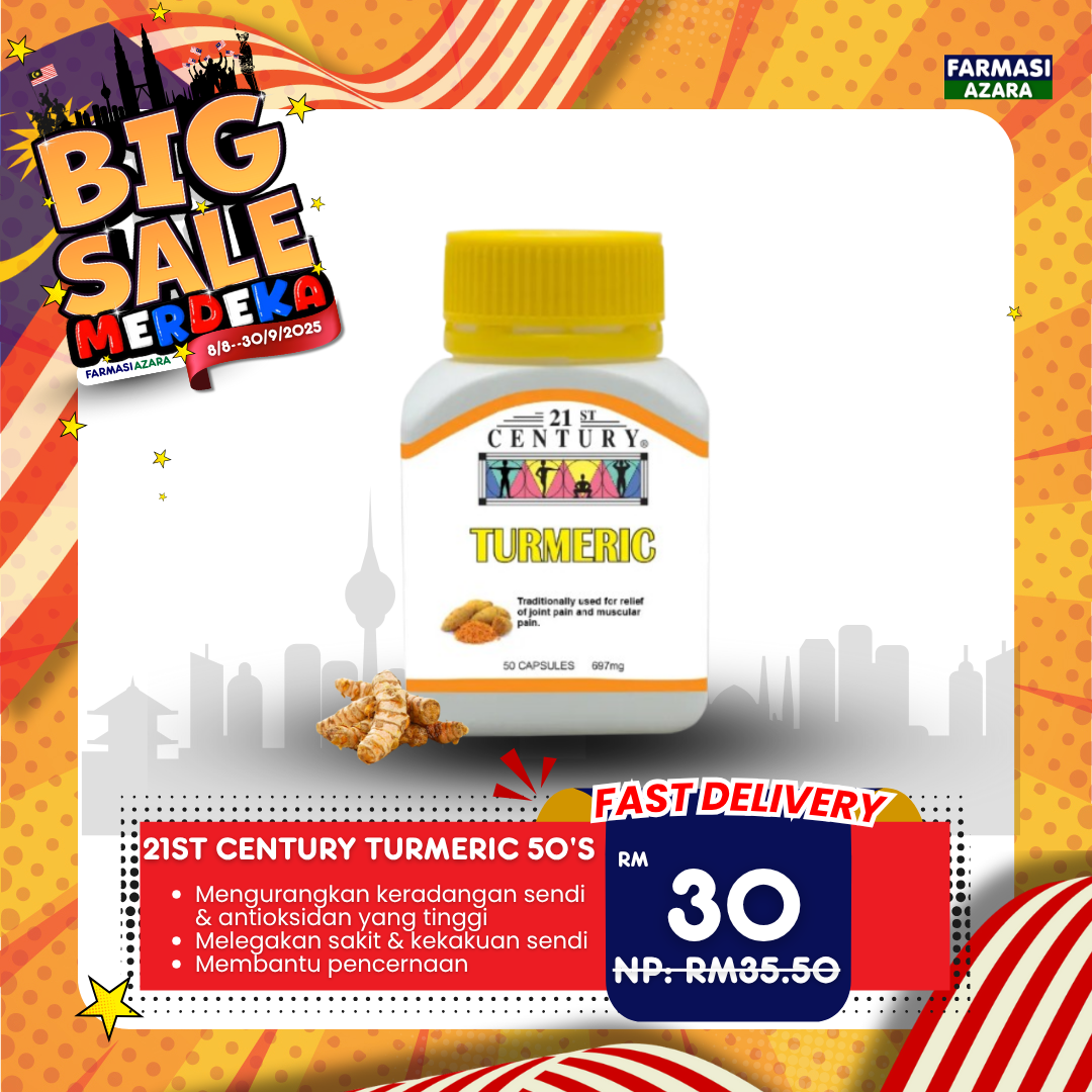 21st Century Turmeric 50’s menawarkan alternatif semula jadi dan selamat untuk membantu melegakan keradangan, menenangkan sendi dan menyokong kesihatan keseluruhan. Ia menggunakan ekstrak kunyit pekat yang telah distandardkan kepada 95% curcuminoids – bahan aktif yang terbukti mempunyai kesan anti-radang dan antioksidan kuat.