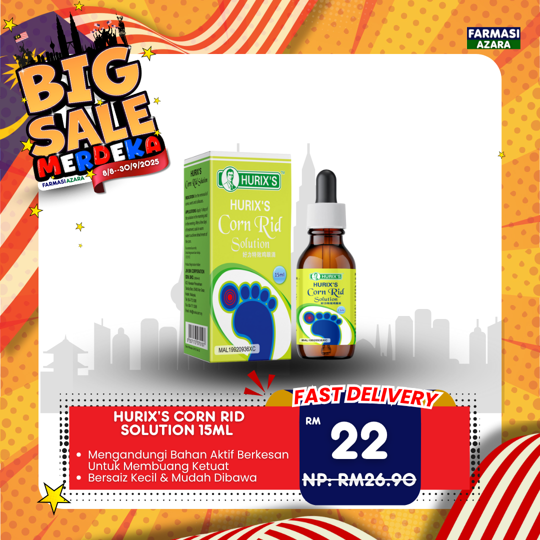 Jangan tunggu sehingga corn makin dalam atau ketuat merebak. Dapatkan Hurix’s Corn Rid Solution 15ml sekarang dan rasai perbezaannya. Mudah, selamat dan efektif — pilihan ramai pengguna bijak!