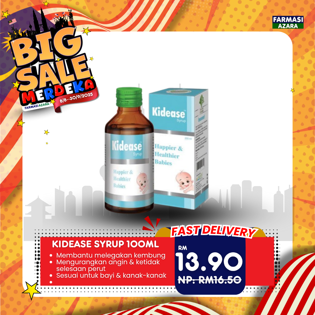 Kidease Syrup 100ml adalah formula cecair yang dirumus khas untuk melegakan gejala kembung, kolik dan masalah angin dalam perut. Ia membantu mengurangkan ketidakselesaan perut dan menjadikan bayi lebih tenang, senang tidur dan kembali aktif seperti biasa.