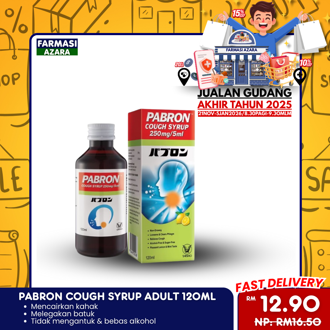Pabron Cough Syrup 250 mg/5 ml (120 ml) – sirap mucolytic bukan mengantuk yang efektif. Formula alcohol‑free dan sugar‑free dengan rasa lemon-mint segar, membantu melonggarkan kahak dengan cepat untuk melegakan batuk berdahak. Sesuai untuk dewasa dan remaja 15 tahun ke atas.