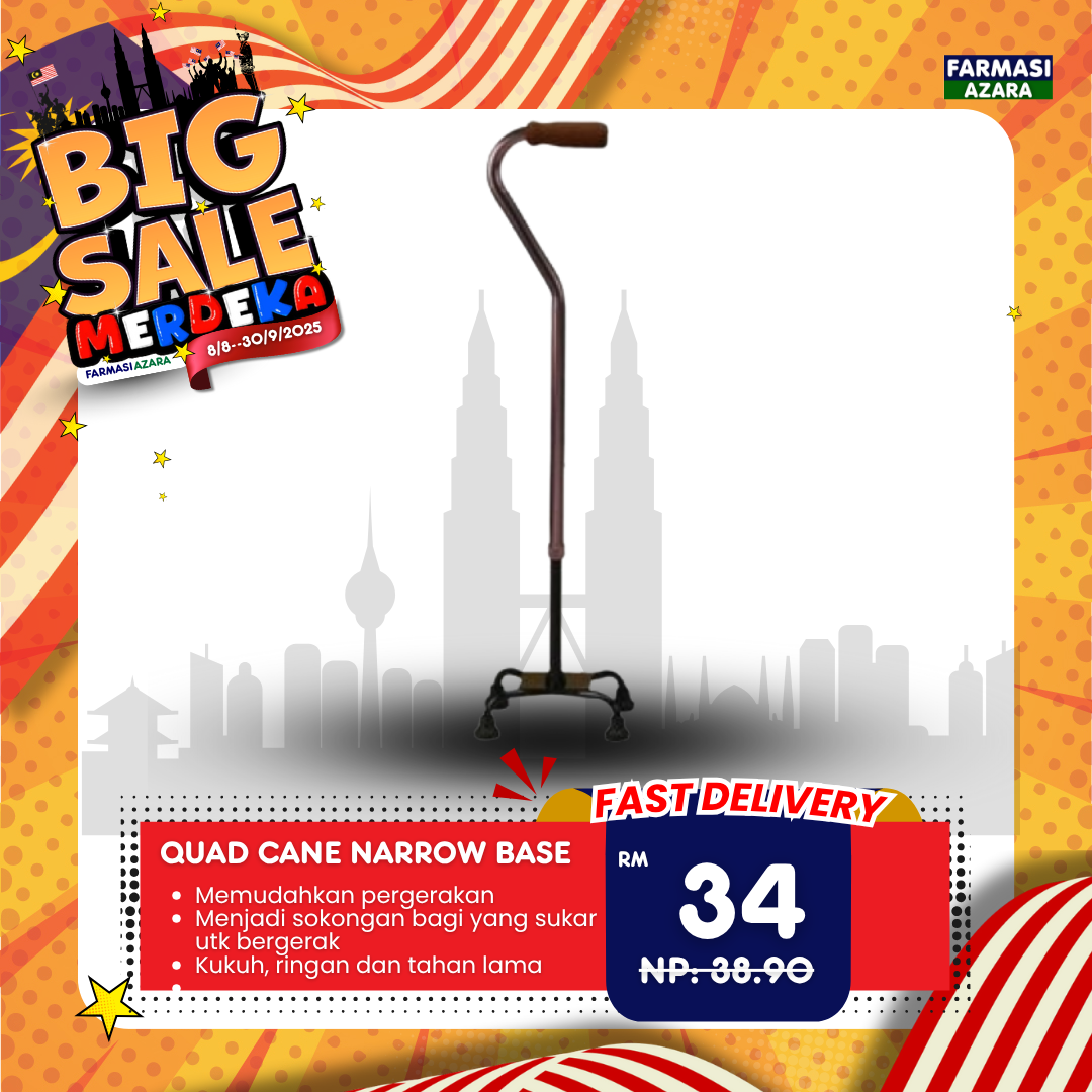 Quad Cane Narrow Base merupakan tongkat bantuan berjalan yang mempunyai empat kaki (quad base) dengan tapak sempit, memberikan keseimbangan tambahan tanpa menjejaskan pergerakan semula jadi kaki. Reka bentuk ini sangat sesuai untuk pengguna yang masih aktif tetapi memerlukan sedikit sokongan semasa berjalan, terutamanya di kawasan sempit seperti koridor atau tangga.