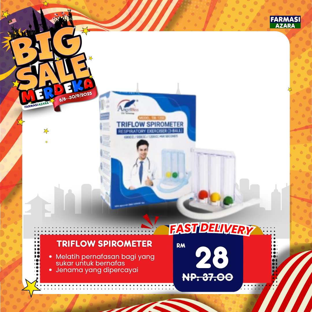 Triflow Spirometer merupakan alat latihan pernafasan yang direka untuk membantu memperbaiki dan menguatkan fungsi paru-paru. Ia amat berguna bagi pesakit yang sedang dalam proses pemulihan selepas pembedahan, mengalami masalah paru-paru seperti asma, COPD, atau mereka yang memerlukan latihan pernafasan akibat kurang aktif.